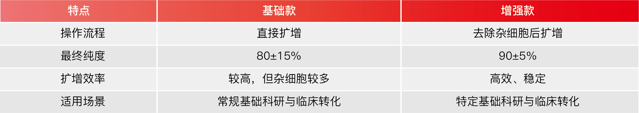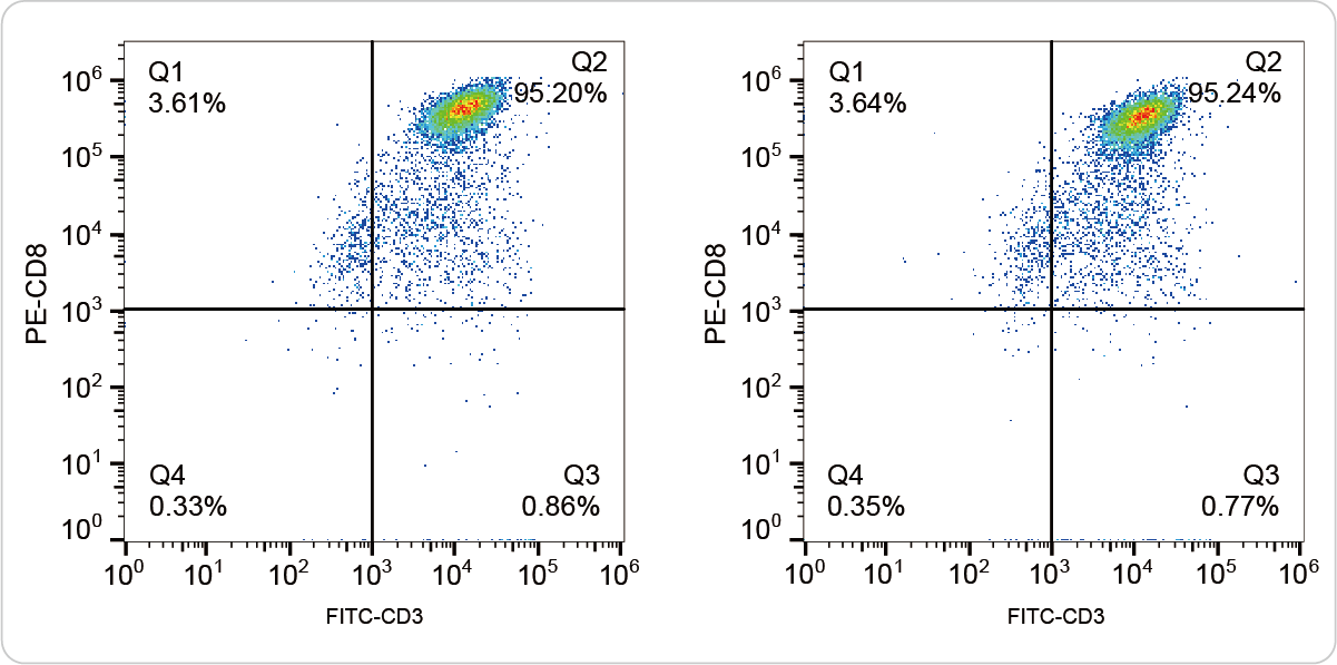 本产品适用于从人新鲜或冻存的外周血、脐血、浓缩白细胞来源的单个核细胞在体外扩增成细胞毒性T细胞,增强款在去除非CD8+T细胞基础上扩增成高纯度细胞毒性T细胞,分选后CD8+T细胞经过14天培养,总细胞数可以扩增约50-100倍左右,终末细胞CD3+CD8+T纯度为90±5%。