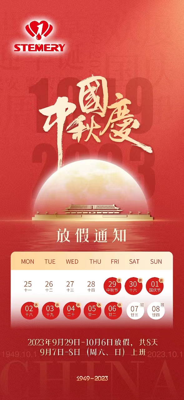 中秋国庆双节,公司放假时间为9月29日-10月6日,共计8天,10月7号正常上班发货,放假期间正常接单.