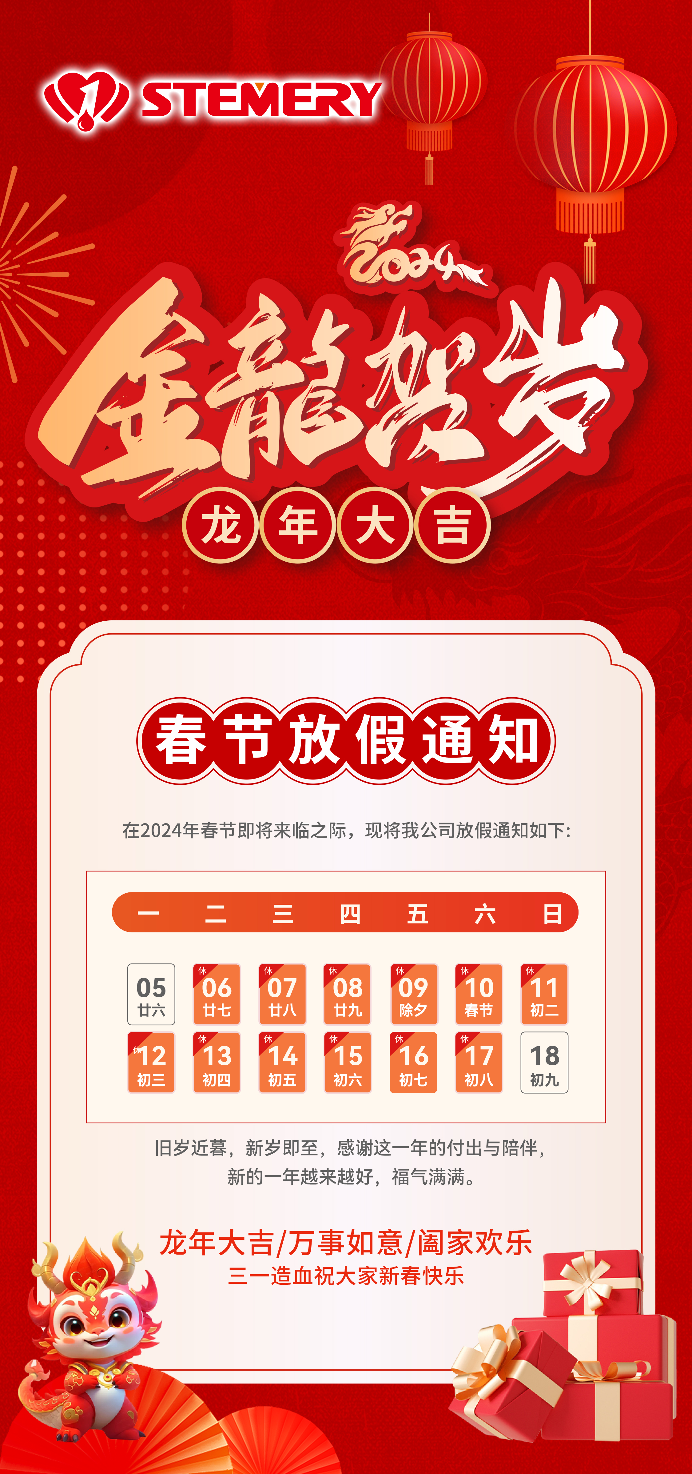 非常感谢大家一直以来对三一造血的信任与支持,在2024年春节即将来临之际,三一造血携全体员工提前恭祝大家:新春快乐、龙年大吉、事业兴旺!