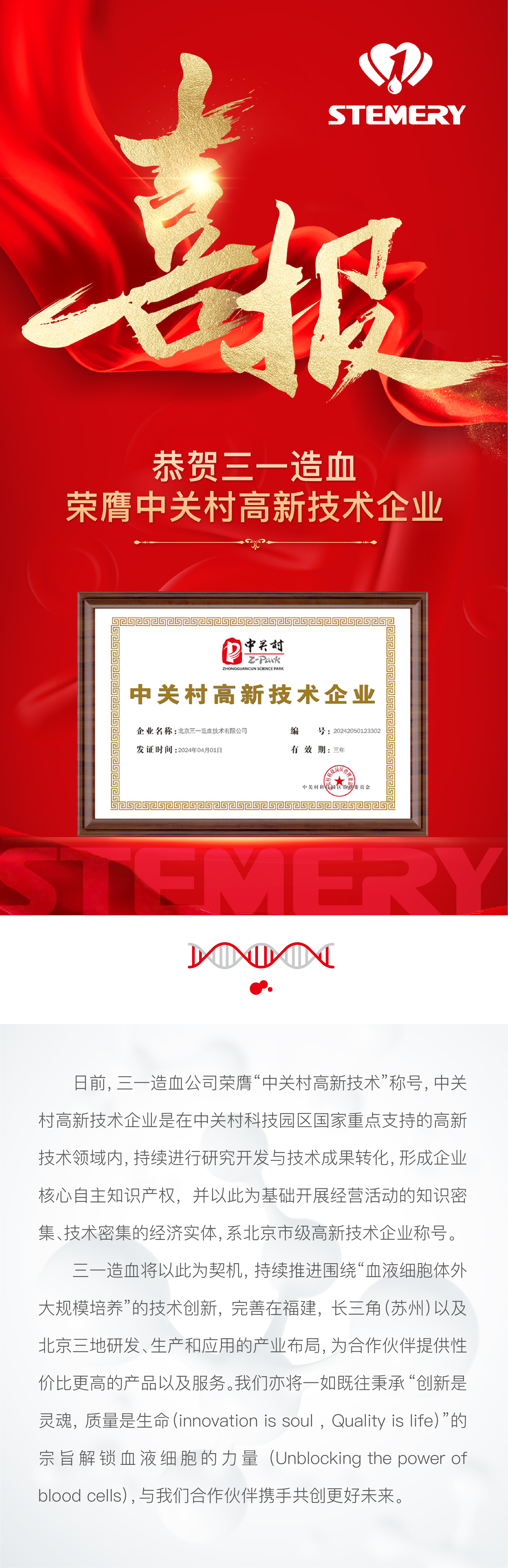恭贺三一造血荣膺中关村高新技术企业