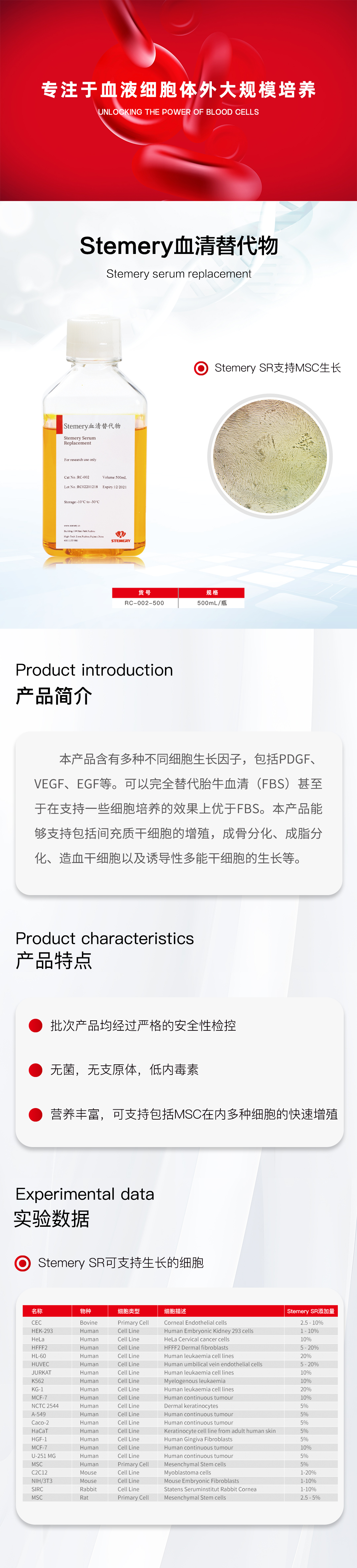 本产品含有很多不同的细胞生长因子,包括 PDGF, VEGF,EGF 等,能够对多种细胞起到支持生长的作用,可以完全替代胎牛血清(FBS)甚至在支持一些细胞培养的效果上优于 FBS。本产品经过了严格安全性有效性质量检控,能够支持包括间充质干细胞成骨分化,成脂分化,造血干细胞以及诱导性多能干细胞的生长。
